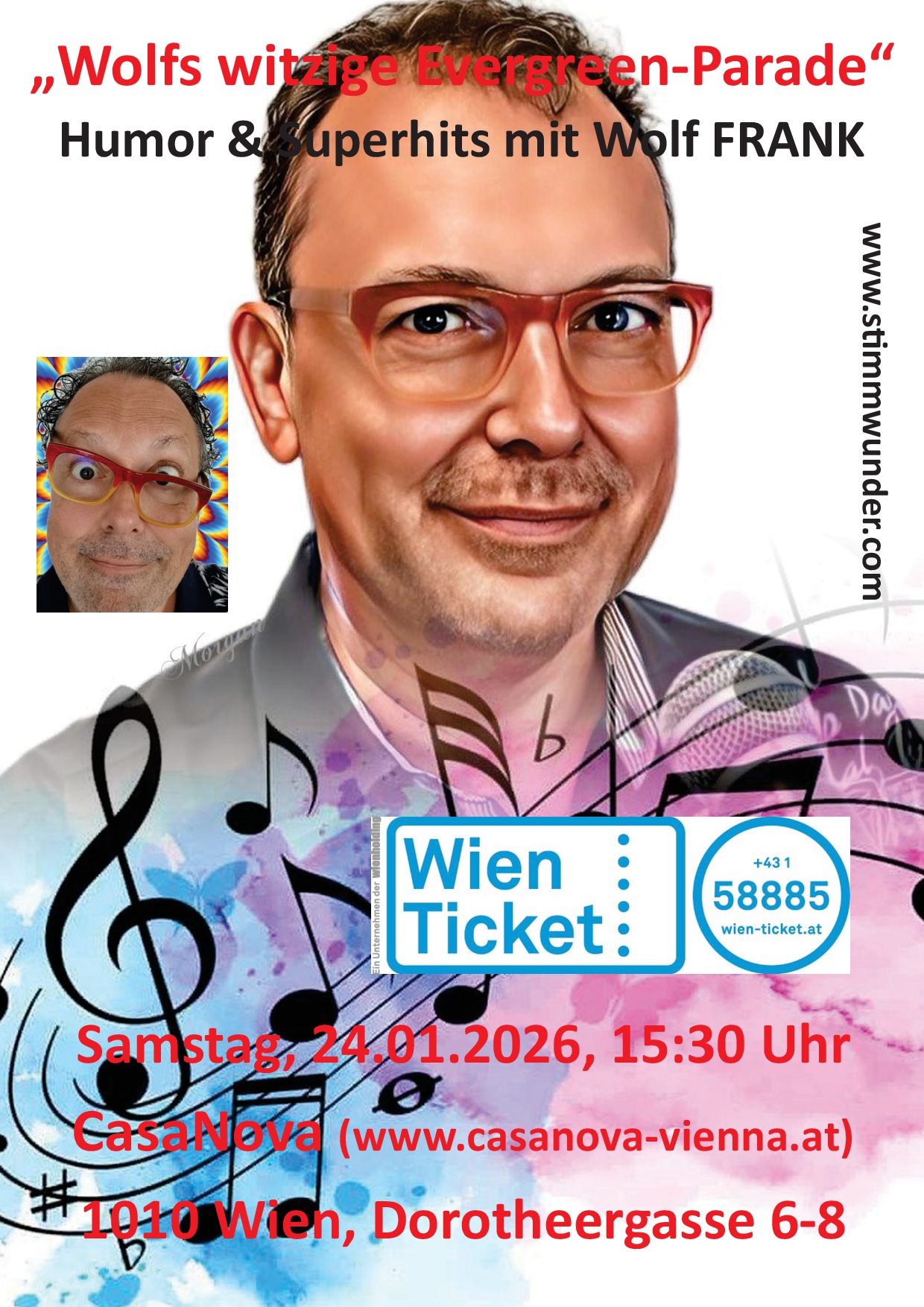 Erleben Sie am Sa. 24.01.2026 um 15.30 Uhr Wolf FRANK's sensationelle, humorvoll-musikalische Show "Wolfs witzige Evergreen-Parade" im großartigen Ambiente des CasaNova Vienna in Wiens City!