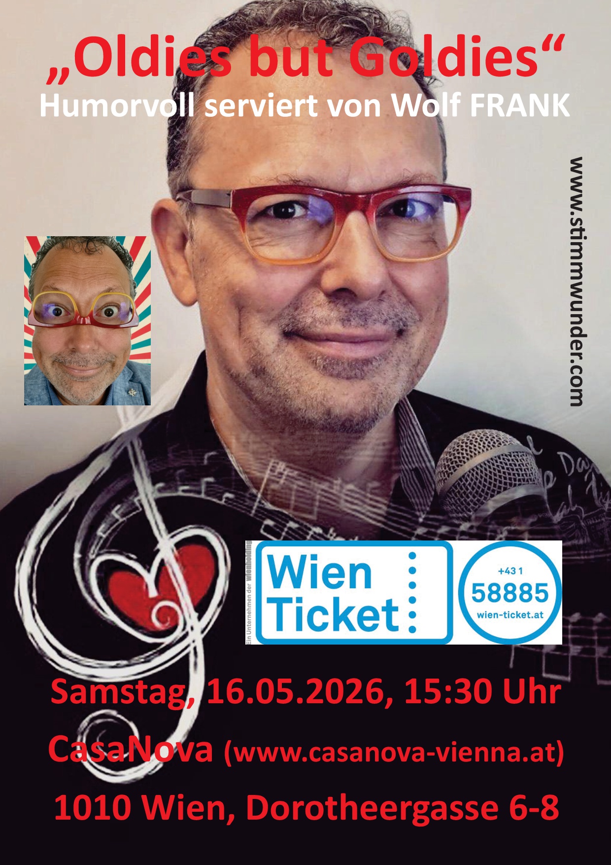 Erleben Sie am Sa. 16.05.2026 um 15.30 Uhr Wolf FRANK's sensationelle, humorvoll-musikalische Show "Oldies but Goldies" im großartigen Ambiente des CasaNova Vienna in Wiens City!